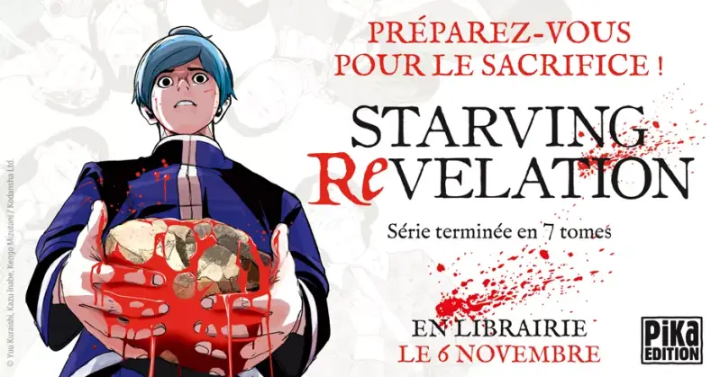 Prépublié au Japon entre 2021 et 2023 sur le site Comic Days de Kôdansha pour un total de 7 volumes, Starving Revelation réunit à nouveau les auteurs de la première série. Rappelons que le scénariste et le dessinateur sont également connus pour les mangas Fortress of Apocalypse et Denjin N.